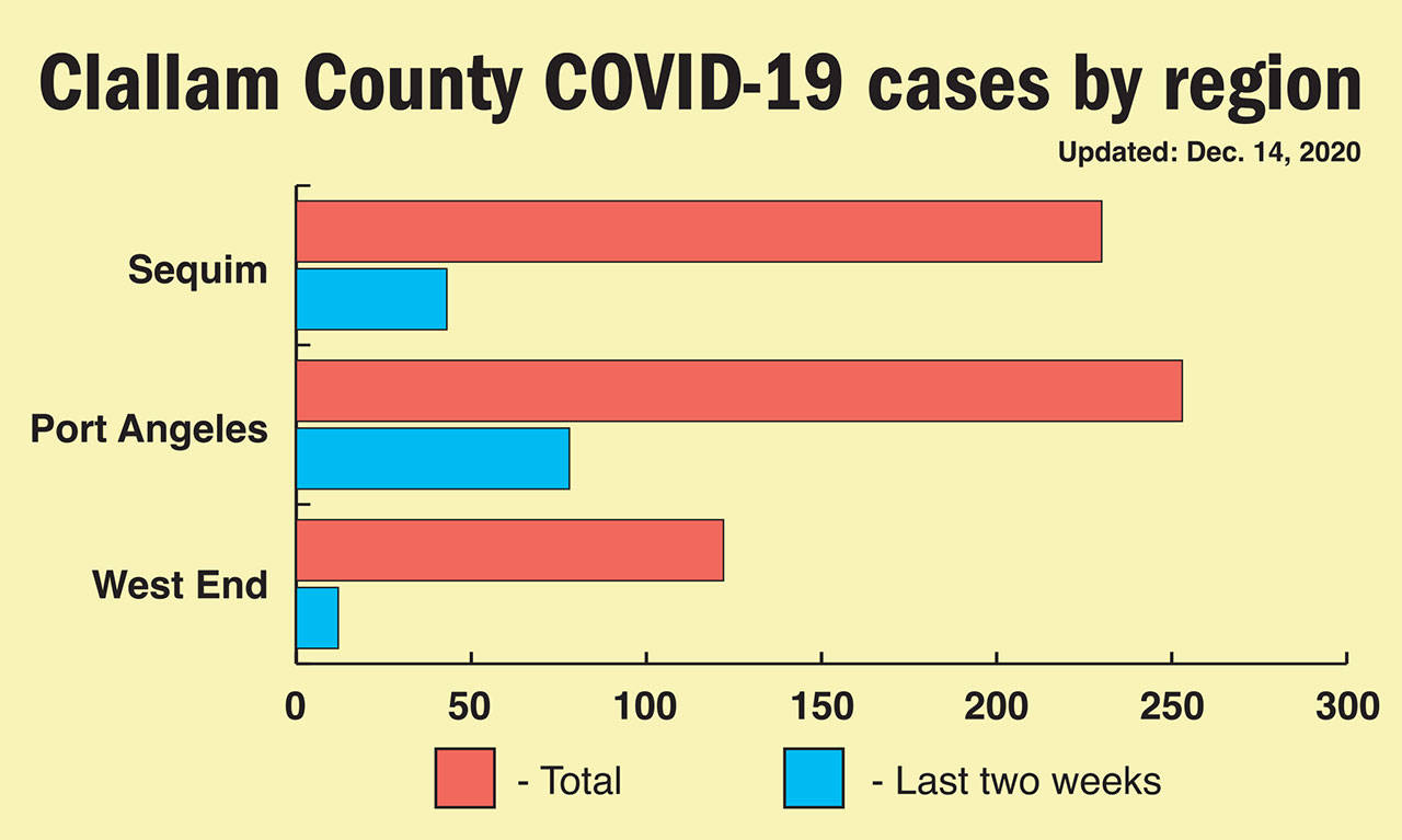 Clallam County had three new cases Friday and six new positives Saturday. That gives Clallam County 664 cases since March and 57 active cases. The infection rate in Clallam County is 121 per 100,000 over the past two weeks, still in the high-risk category, but considerably lower than November, when the rate rose to over 200 per 100,000.