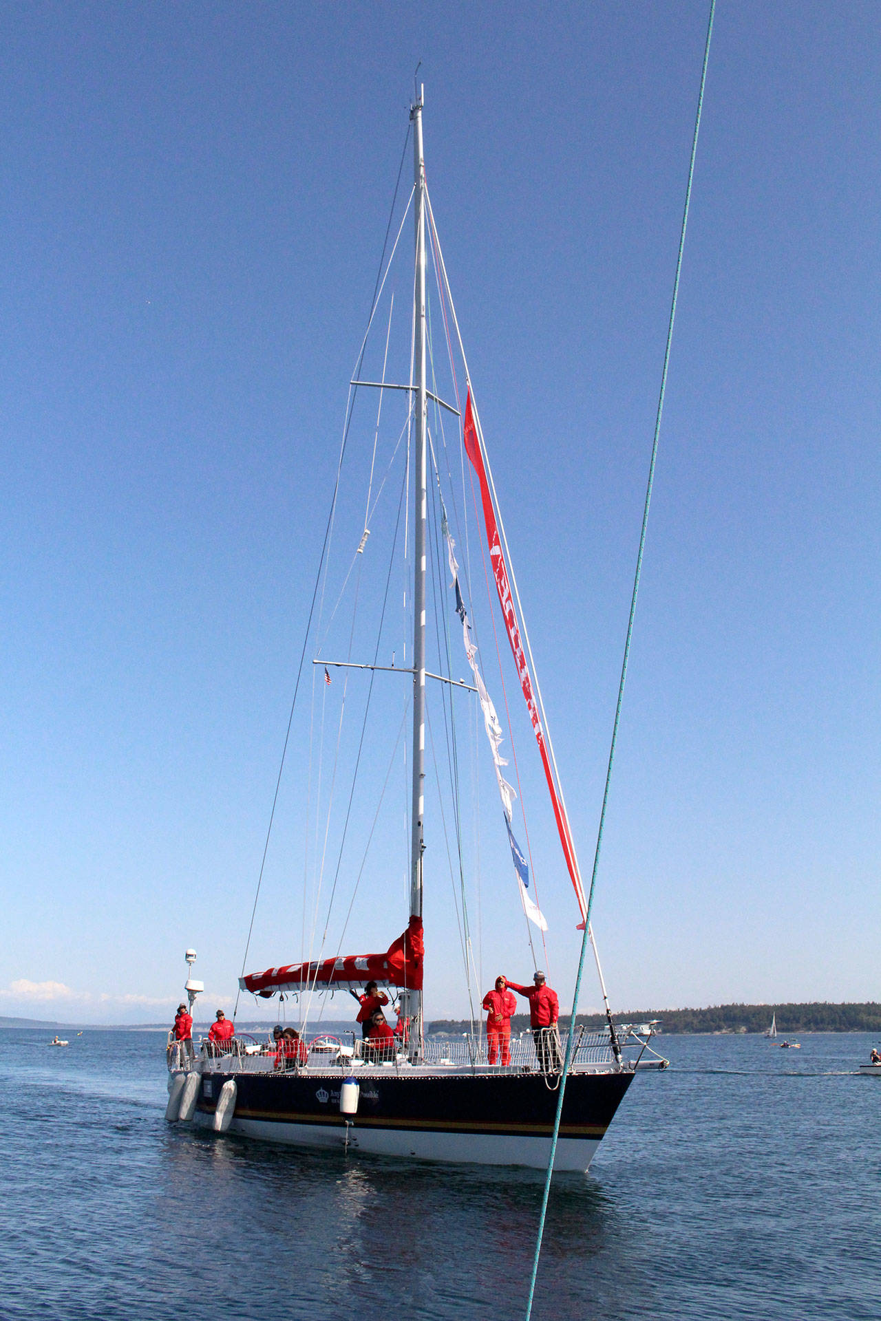 She shared an anecdote about a rough time she had sailing through the area. She sustained a broken rib in rough waters and had to get stitches. A Port Townsend ship met up with them and brought them local produce and pizza, which she said was uplifting for the battered crew.