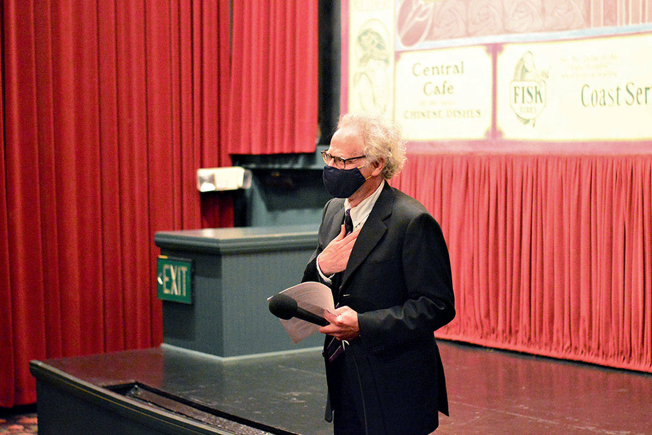 Receiving a standing ovation from the audience at the Rose Theatre on Wednesday night, owner Rocky Friedman expressed his gratitude to supporters who waited 499 days for the downtown Port Townsend cinema to reopen. Friedman also introduced his mother Miriam, 101, during his speech before the showing of the film “The Truffle Hunters,” from Italy. The two-screen movie house is using a MERV-13 air filtration system and selling two-thirds of the seats for each screening. (Diane Urbani de la Paz/Peninsula Daily News)
