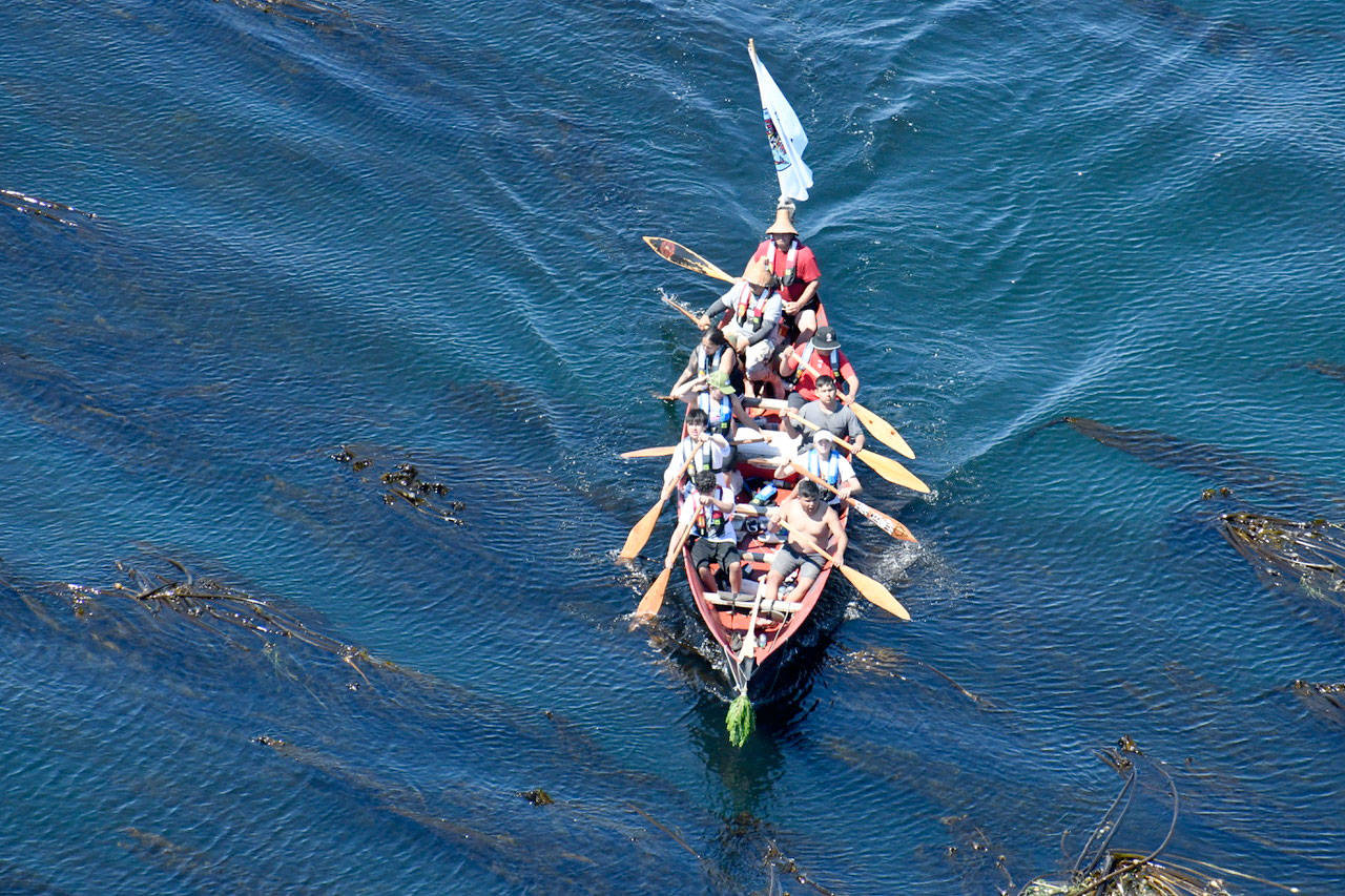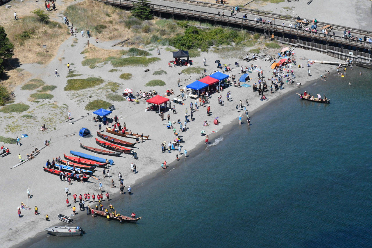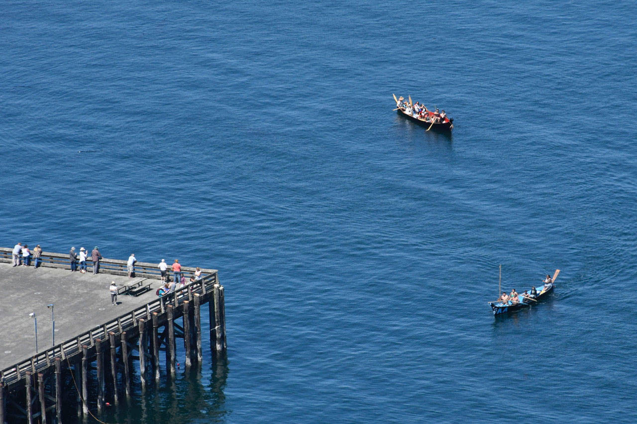 When they left Port Angeles with members of the Lower Elwha Klallam tribe, there were 32 canoes from Washington coast tribes or Canadian First Nations. They picked up about 10 more Monday, including more from Canada, arriving to a welcome from the area’s Klallam tribes.