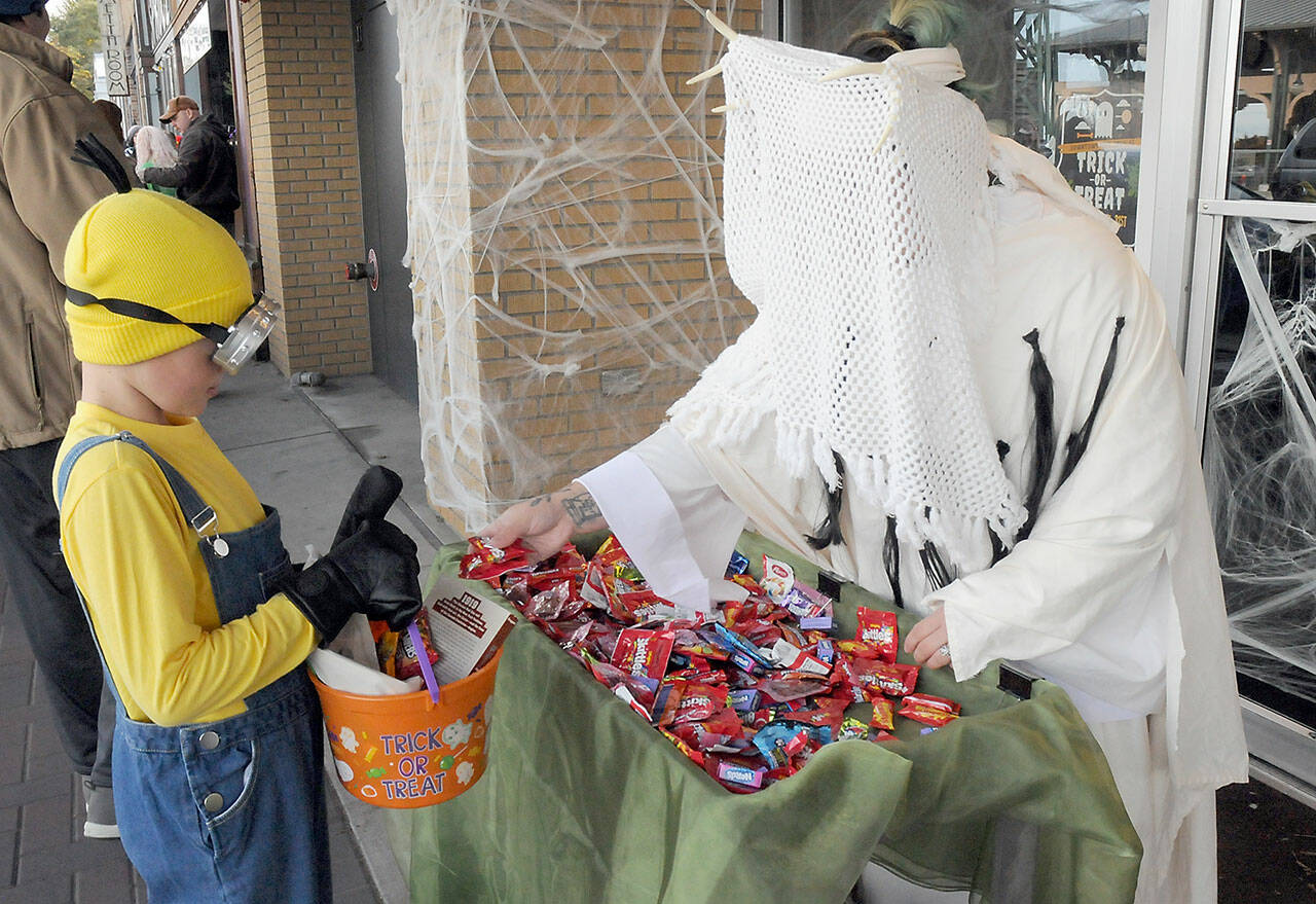 Oliver Kelly, 8, of Port Angeles, dressed as a minion, receives a treat from Kayla Munger, manager of Olympic Stationers, during the community trick-or-treating event in downtown Port Angeles. Hundreds of children and adults celebrated Halloween on Thursday. (Keith Thorpe/Peninsula Daily News)