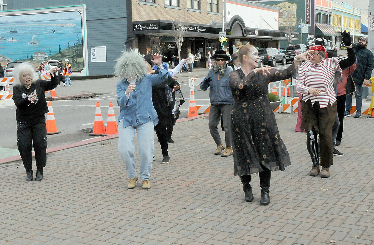 Members of the Port Angeles Senior Center perform the “Thriller” dance to the music of Michael Jackson at the plaza of the Conrad Dyar Memorial Fountain as part of Halloween festivities in downtown Port Angeles. (Keith Thorpe/Peninsula Daily News)
