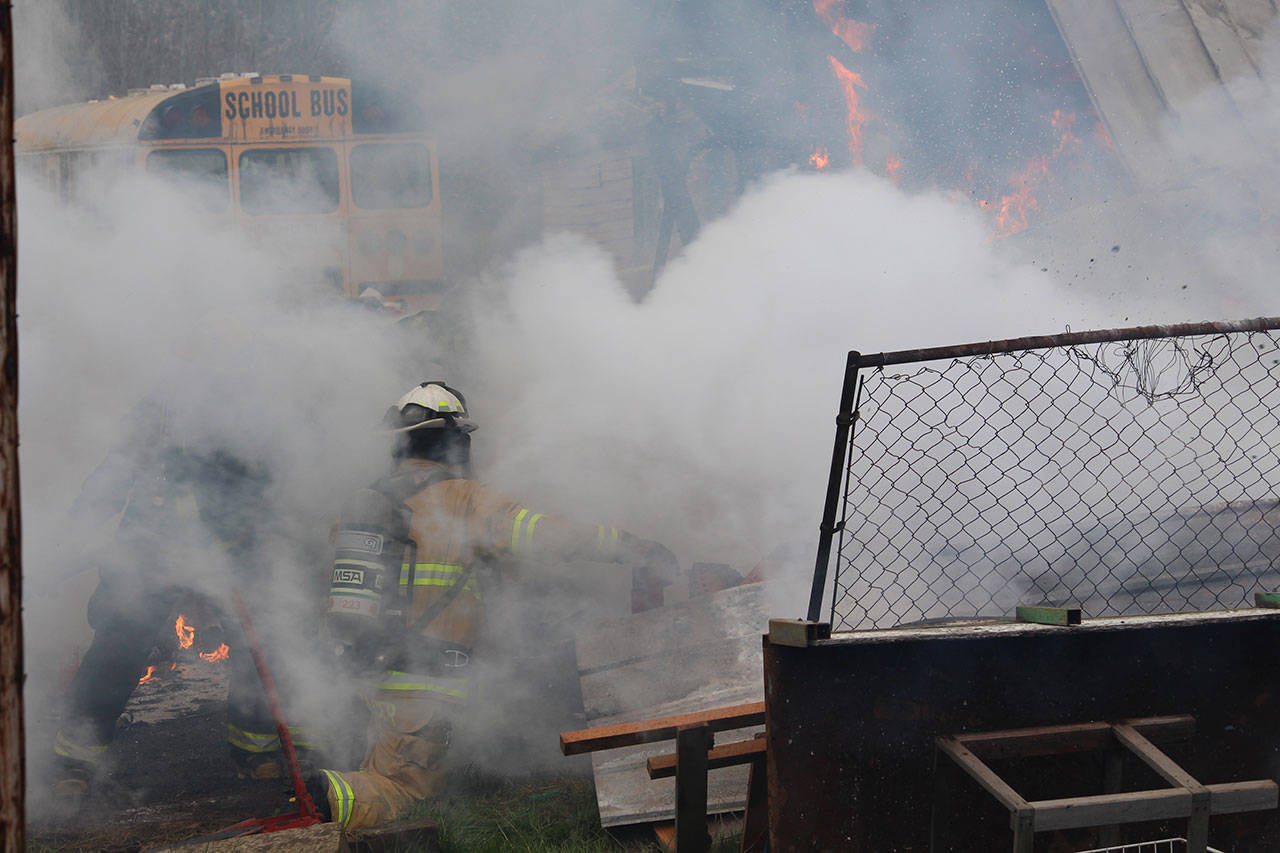 Firefighters kept the blaze from spreading to large piles of firewood and lumber around the property, as well as a few outbuildings, old vehicles and even two school busses that were full of lumber, McKern said.