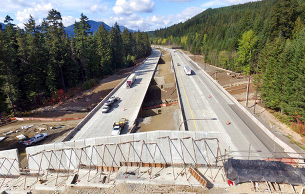 Washington state is finishing work on its largest wildlife bridge. The 35-foot-tall, 66-foot-wide structure emerges from the forest and forms two arches above the highway, one for each direction of traffic.