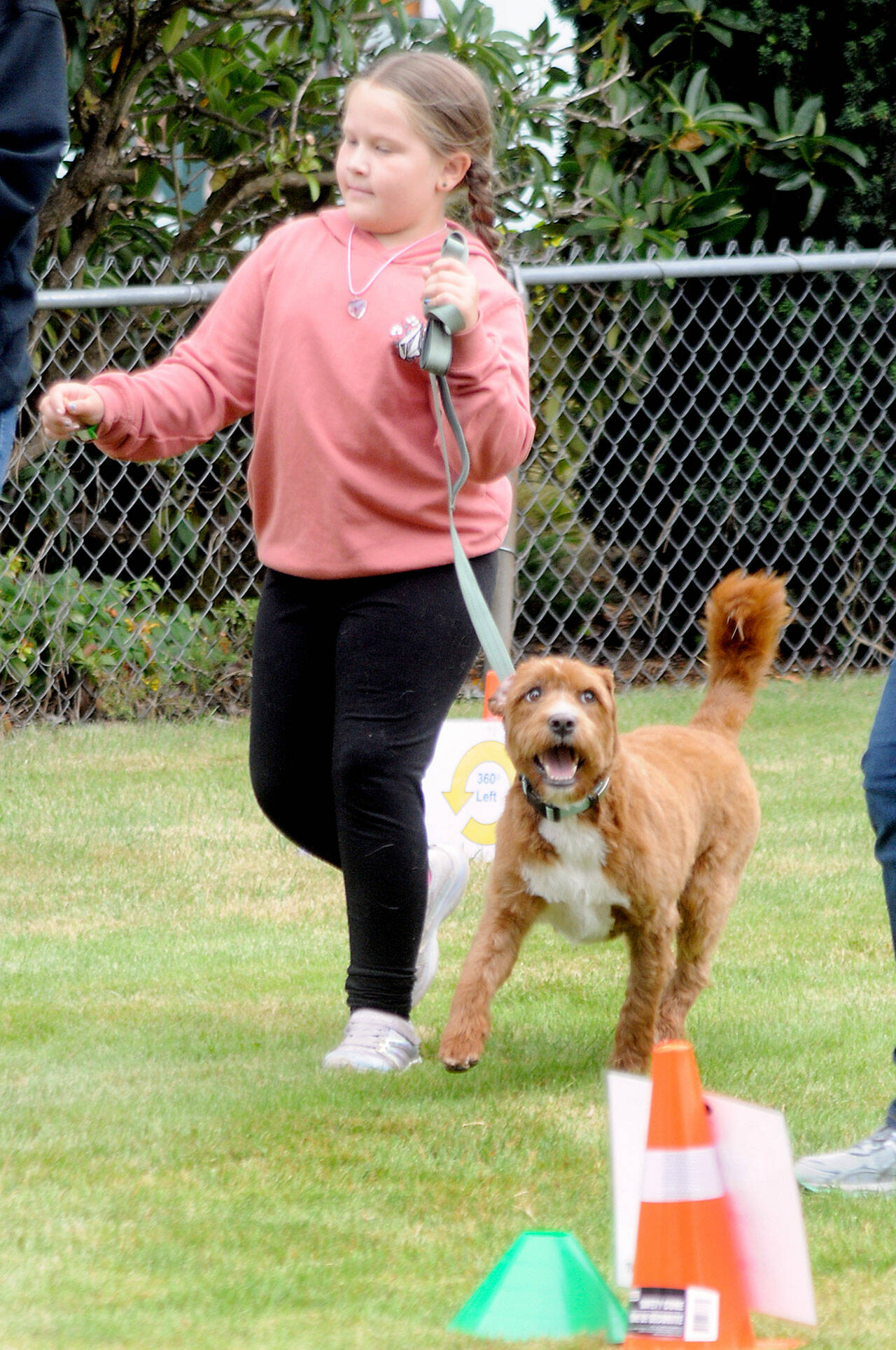 Sophia Murphy, 8, of Port Angeles walks around the show ring with her alpaca, Julie, during Saturday’s alpaca costume parade at the Clallam County Fair.