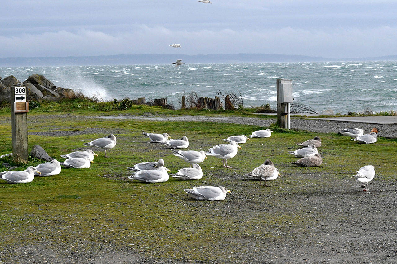 Below, seagulls hunker down at Point Hudson in Port Townsend.