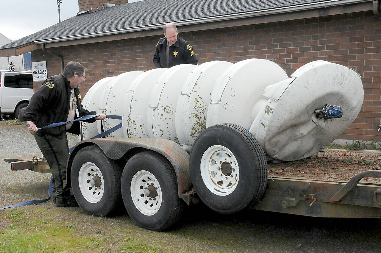 Cameron and Patrol Sgt. John Keegan watched on Friday as a public utilities truck from the City of Port Angeles hoisted the crumpled unit onto a county-run trailer to be hauled off to a county storage yard. Cameron said that it might be possible that the state could salvage parts from it.