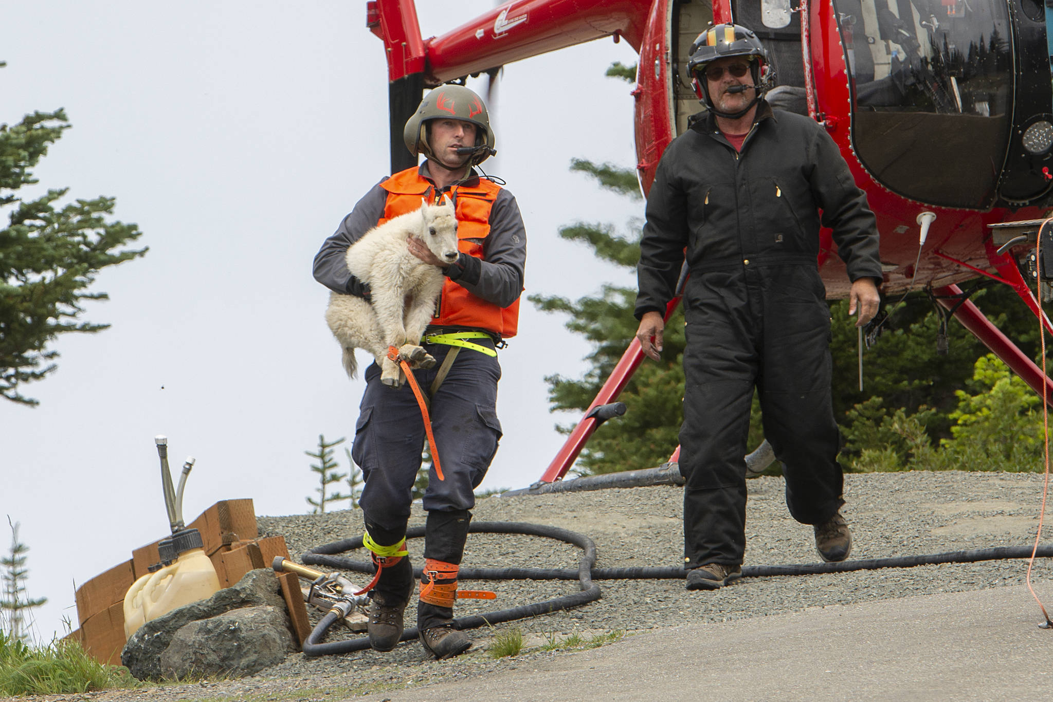Over several weeks in August, goats were tranquilized, captured, blindfolded and taken dangling from slings under helicopters to staging areas at Hurricane Ridge and Hamma Hamma.