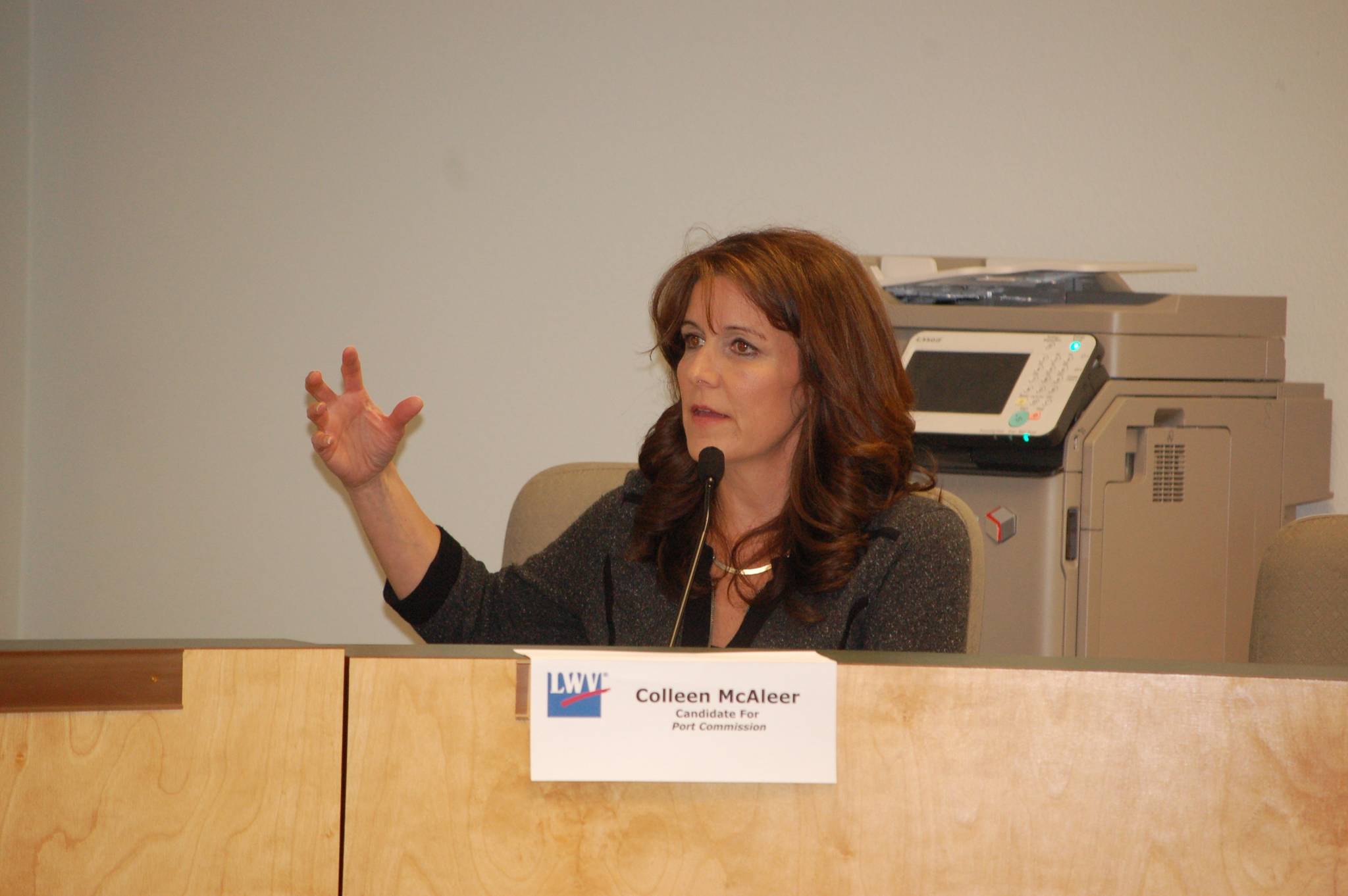 Incumbent port Commissioner Colleen McAleer and her opponent for the District 1 seat, Michael Cobb, took the stage first last Thursday at the Sequim Transit Center and discussed their ideas for economic growth in Clallam County.
