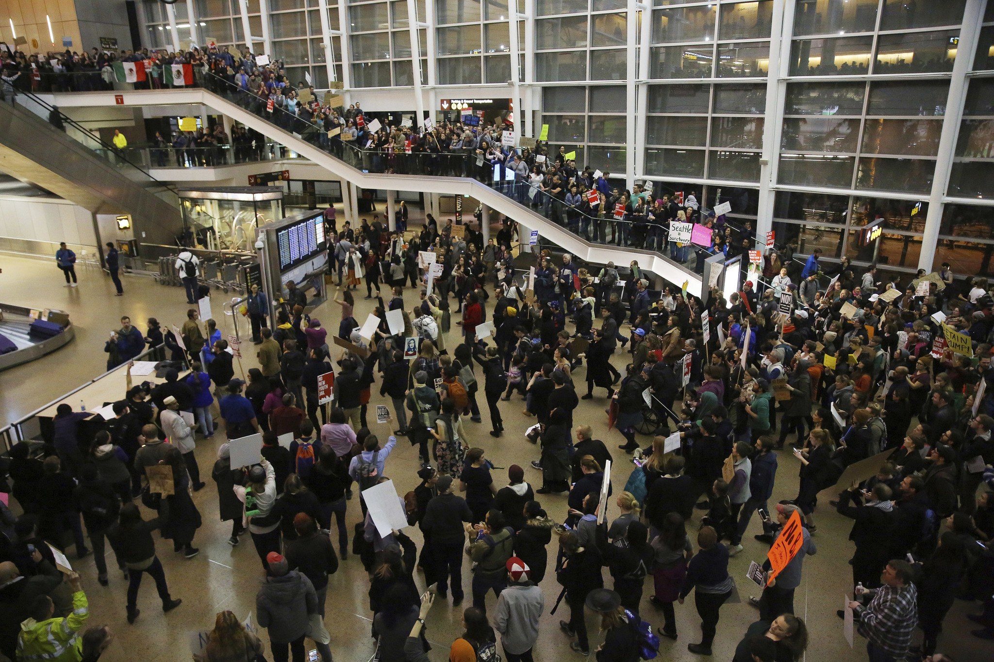 About 3,000 protesters holding signs and chanting “no hatred, no fear, immigrants are welcome here” and “let them in” gathered Saturday evening and continued demonstrating into Sunday morning.
