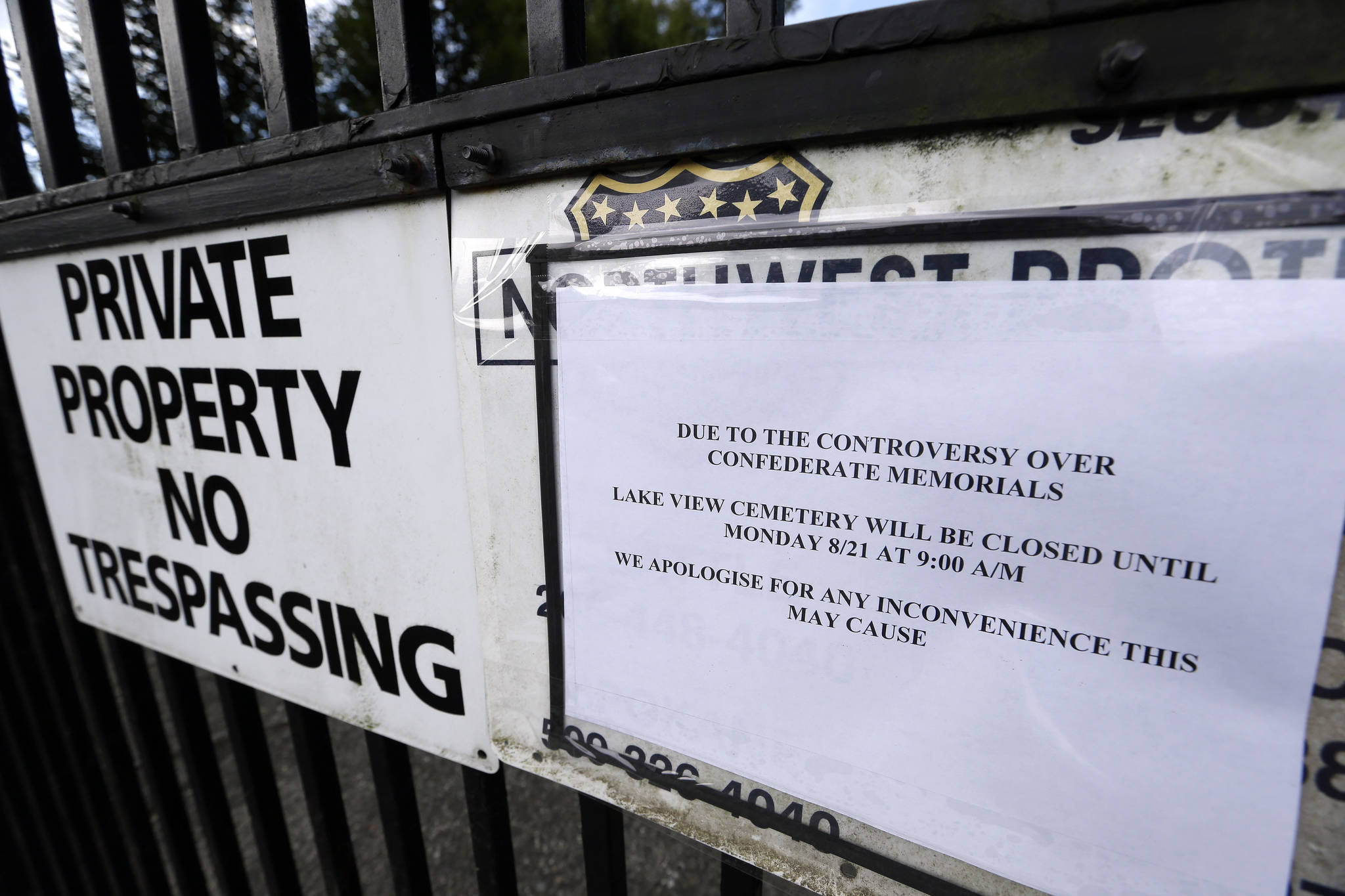 Lake View Cemetery closed Wednesday after receiving threats about the monument and said it would remain closed until Monday due to the controversy.