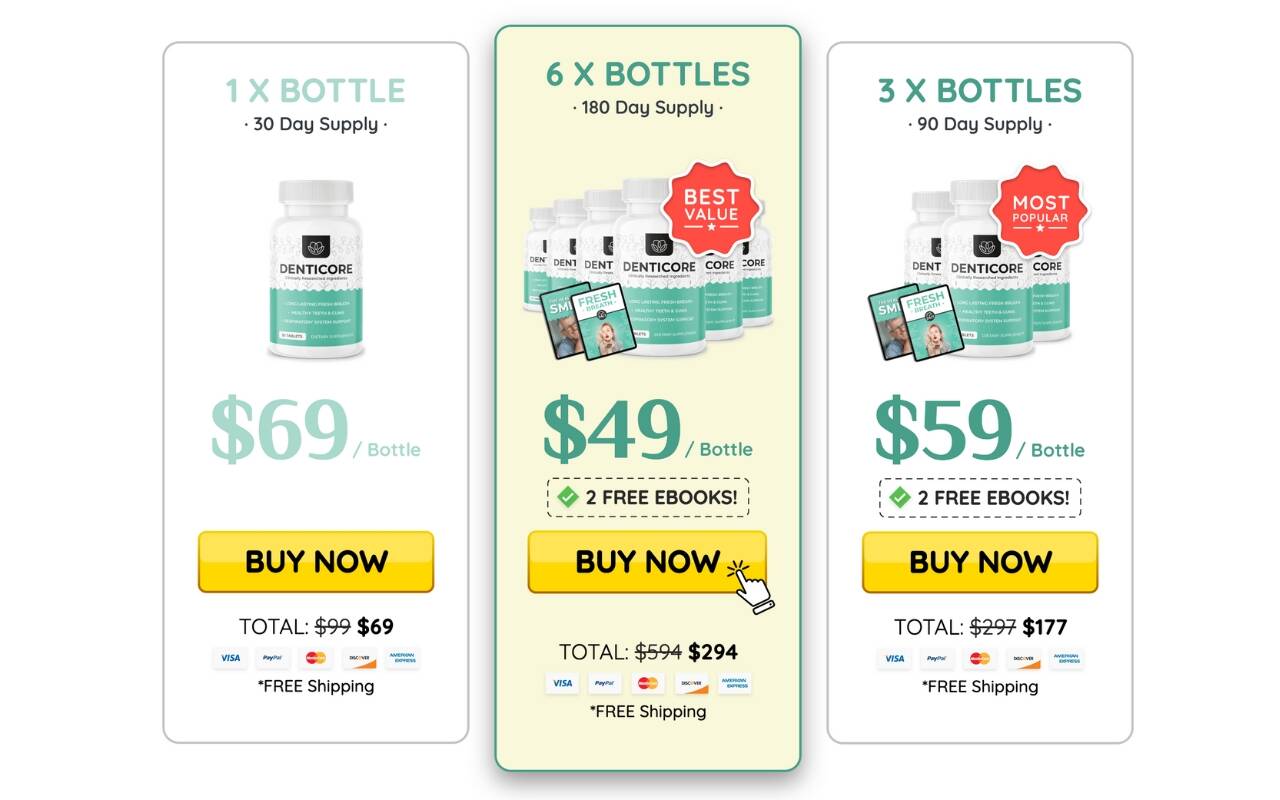 The most cost-effective choice is the 6 X BOTTLES bundle, providing a 180-day supply of DentiCore at just $49 per bottle, totaling $294. This package not only includes FREE Shipping but also 2 FREE EBOOKS to support you in maintaining optimal oral health.
