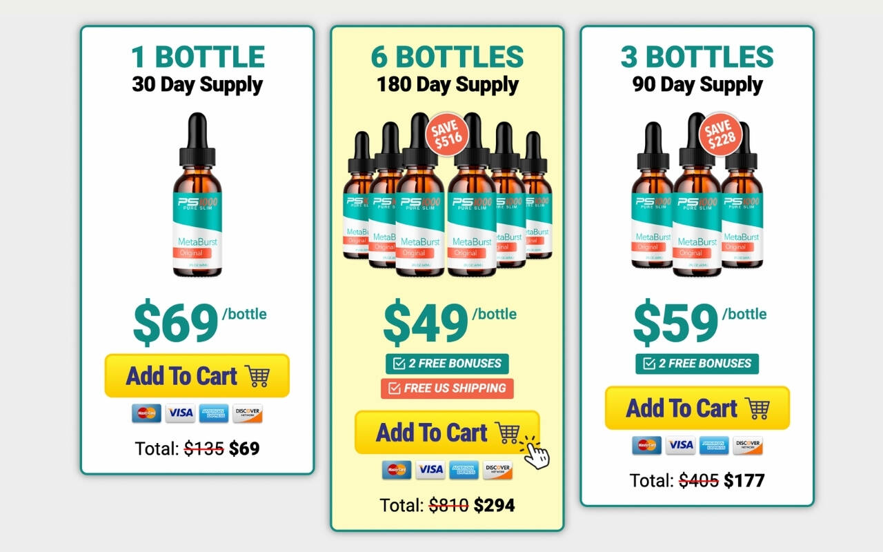 Order Your Supply: Choose the 1-bottle, 3-bottle, or 6-bottle options based on your needs and goals. Each bottle contains a 30-day supply of the potent MetaBurst drops.