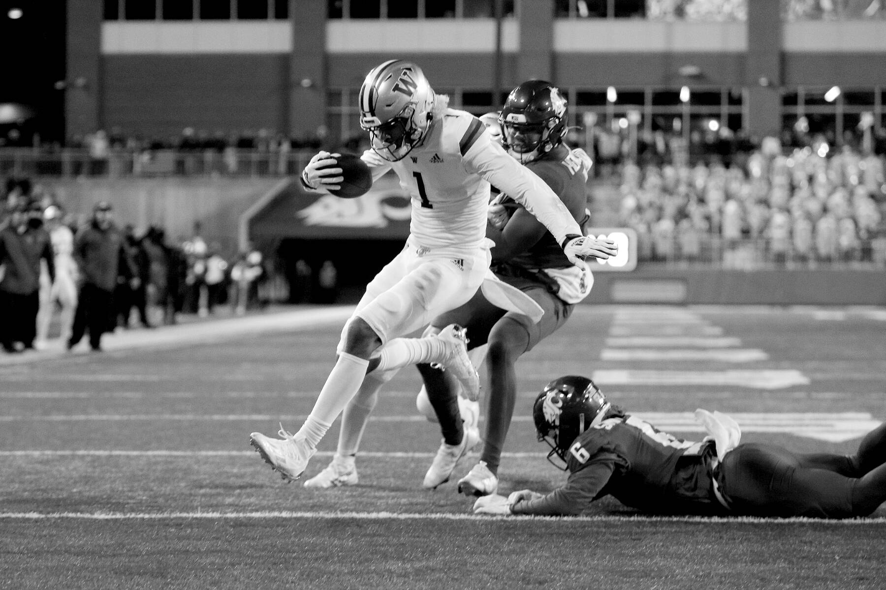 A year after the Huskies watched the Cougars celebrate snapping a seven-game losing streak on the turf of Husky Stadium, Washington kept alive its hopes for a New Year’s Six bowl game thanks to its standout quarterback and a handful of defensive stops in the second half.