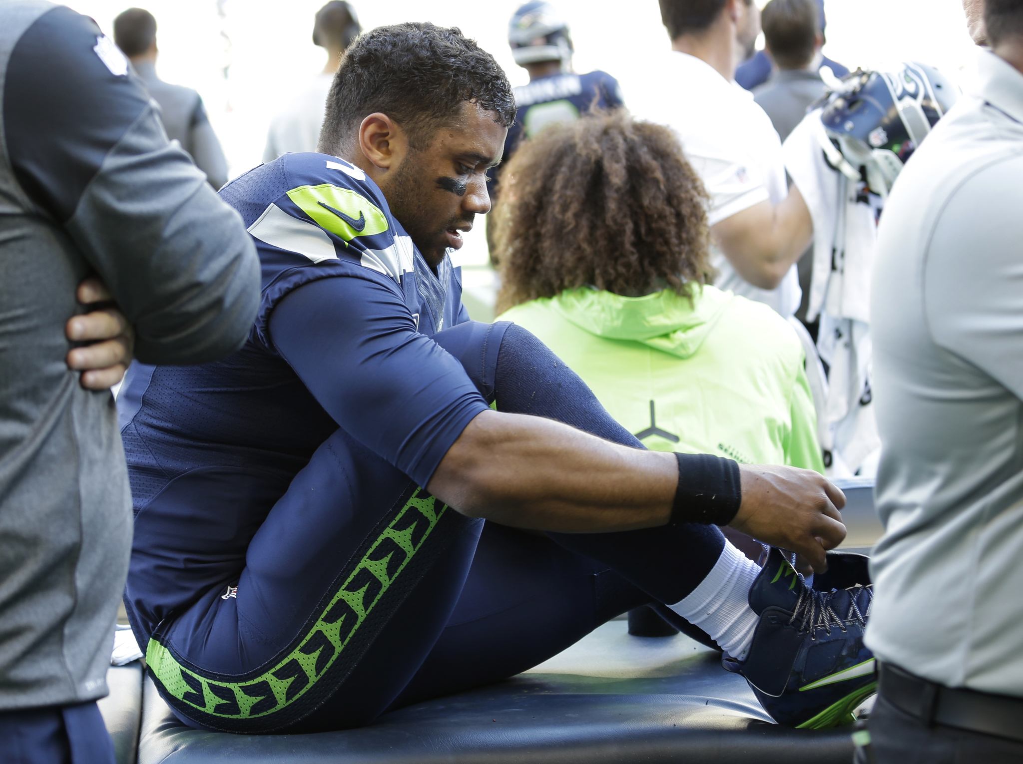 On the opposite sideline, Seahawks players and coaches locked arm in arm. That included defensive back Jeremy Lane, who sat during the national anthem in the preseason finale in Oakland in a sign of support for San Francisco quarterback Colin Kaepernick.