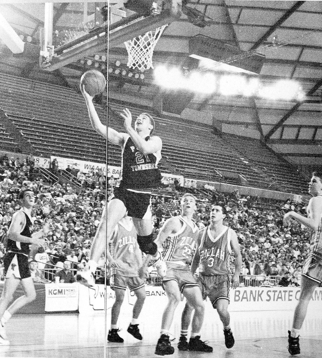 The squad discovered Tom Atkinson waiting for them in the front row of the Tacoma Dome before defeating Meridian in the state opener 54-46. “Meridian was a physical team and a tough matchup for us,” Robertson said. “Andy only scored nine that night and after the game he came up to me and he said, ‘I wasn’t as good tonight, but I’ll be better tomorrow.’”