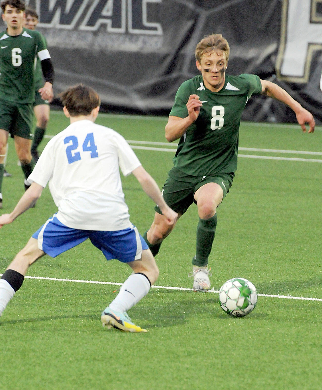 Freshman Matthew Miller was fouled in the box from behind for a penalty kick in the fourth minute and Keane McClain converted the opportunity to the goalkeepers’ right for a 1-0 lead. The foul was severe enough to boot the Bremerton player and give Port Angeles a man advantage.