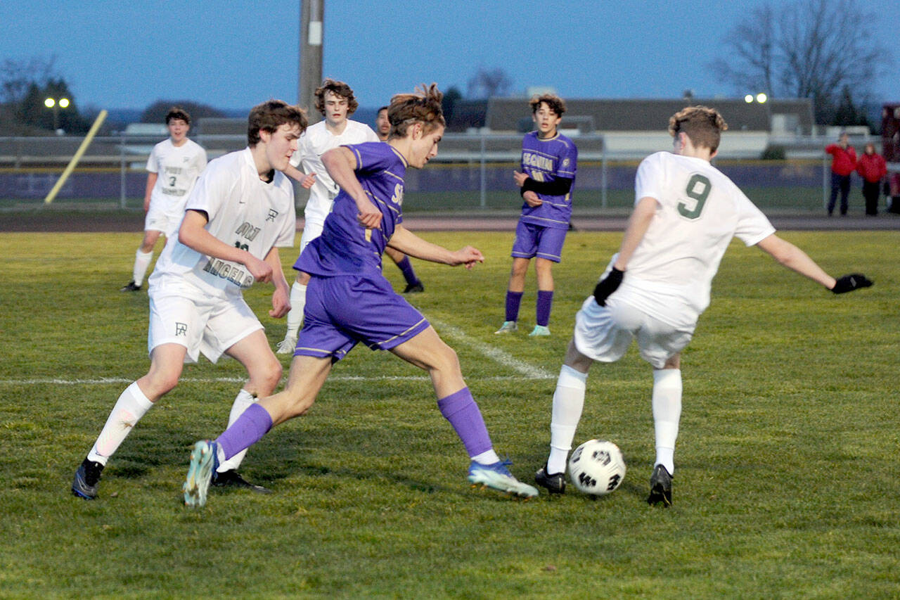 Early on, Port Angeles’ Caleb Lagrange managed to find space and slip past the Sequim defense on two occasions but Wolves’ goalkeeper Nolan Valenzuela was there to make saves on the breakaway attempts.