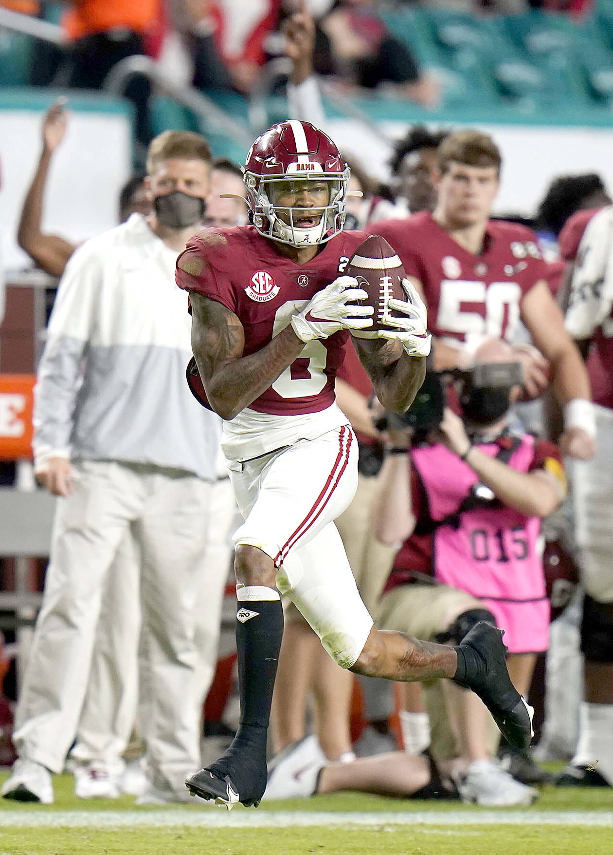 Smith, who finished his freshman season by catching the 2017 national championship-winning touchdown pass from Tua Tagovailoa, ended his Alabama career as the leading career receiver in Southeastern Conference history and the most outstanding offensive player of his third title game.