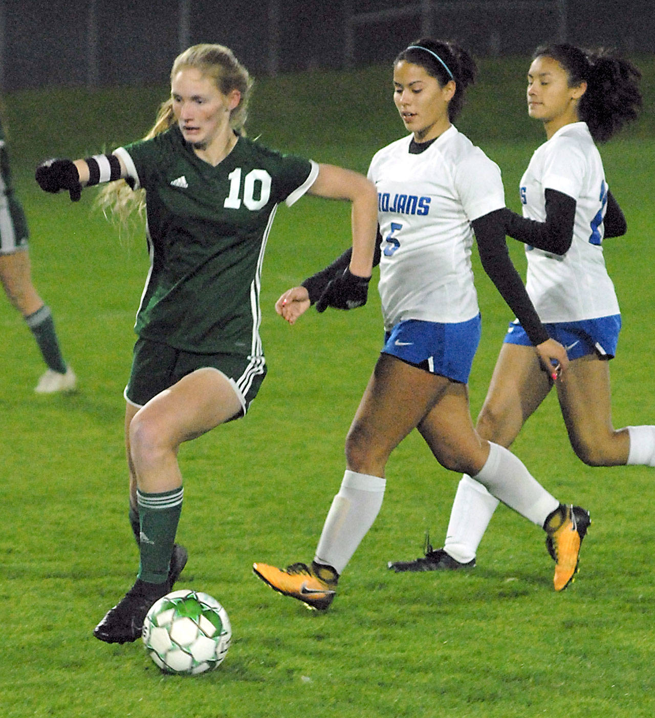 The one down side to the celebratory night for the girls was defensive standout Lucah Folden, who injured a hamstring and had to be carried out of the game. Hannah Reetz filled in on the defensive back line for Folden. Port Angeles coach Scott Moseley said Reetz “did an amazing job.”