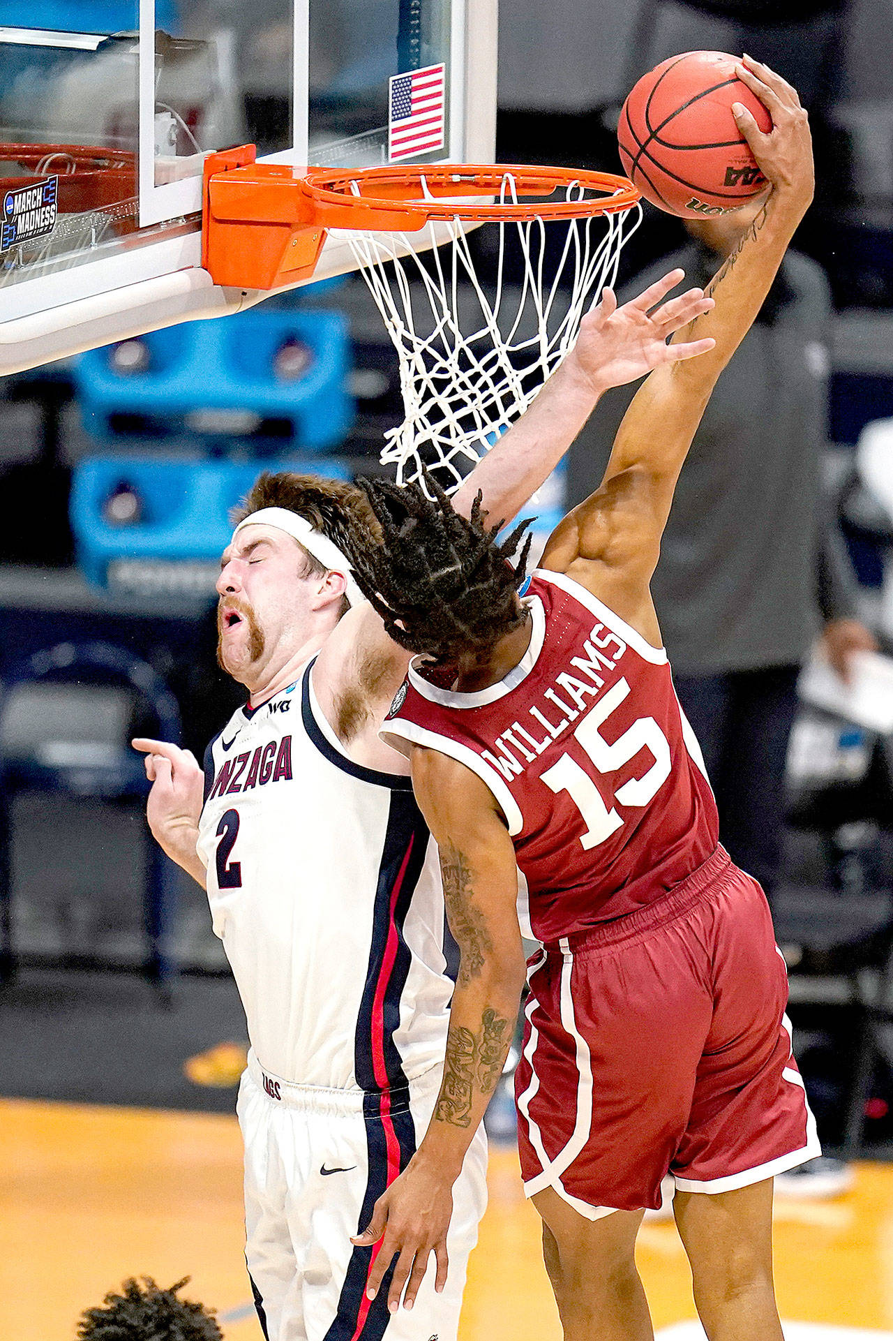 Kispert finished with 16 points, as did Suggs, who took an awkward tumble on a flagrant foul by Oklahoma’s Elijah Harkless in the closing seconds and had to be restrained by teammates. Joel Ayayi added 12 points — 10 coming in the first half when Kispert sat with foul trouble.