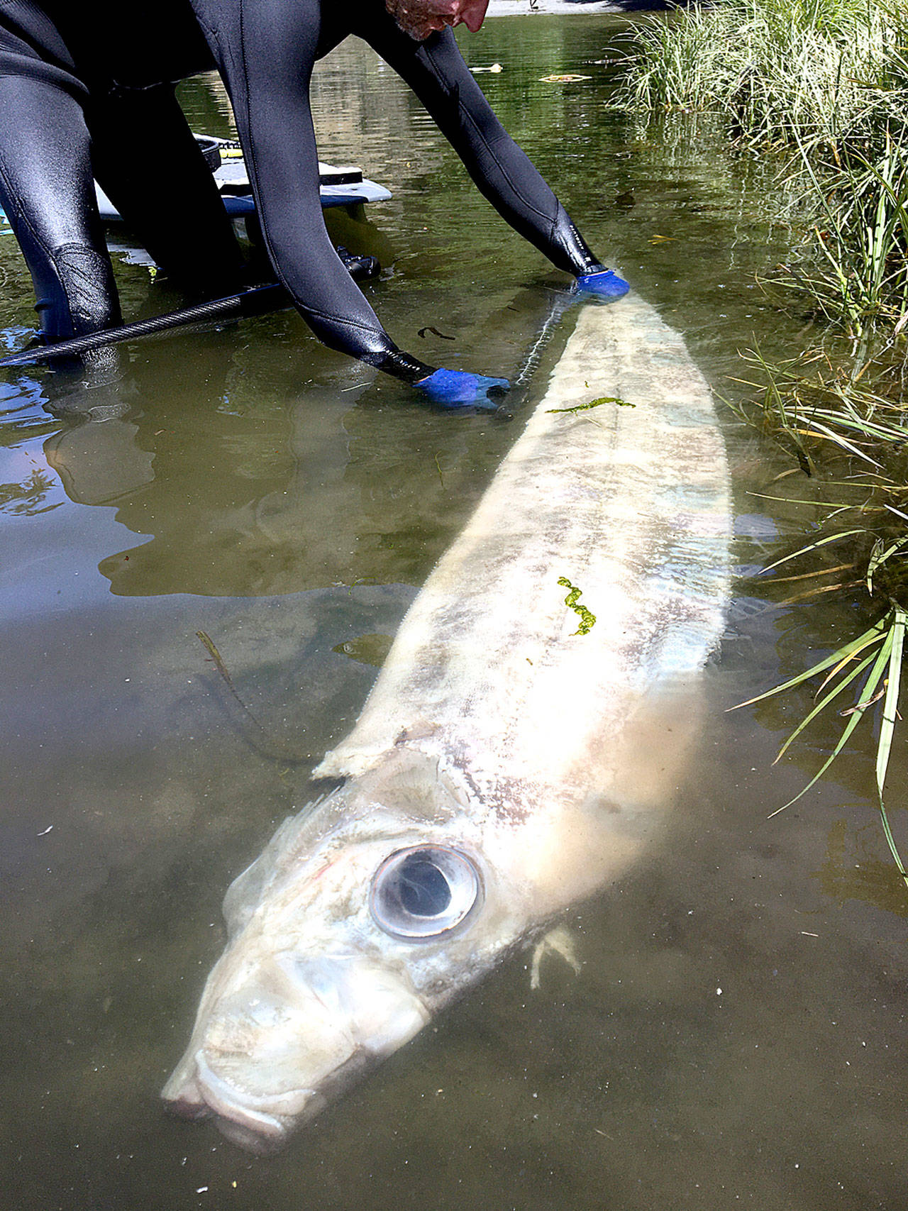 A King-of-the-Salmon is not actually a salmon. It’s in the ribbonfish family and lives in depths down to 3,000 feet along the Pacific coastline from Alaska to Chile. Ribbonfish are rarely seen alive because they tend to live in such deep water.