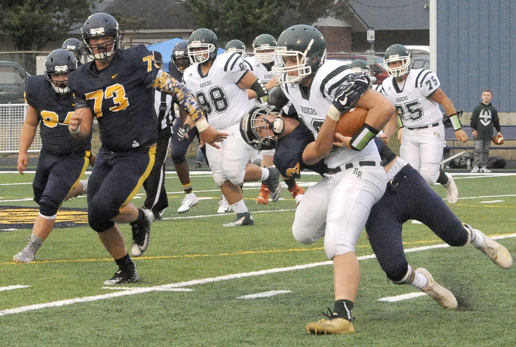 Senior fullback Caleb Peters was a virtual lock to gain 5 yards every time he ran the football, totaling 18 carries for 101 yards and two rushing touchdowns. Peters’ bruising classmate Tristen Pisani added 15 carries for 107 yards, including a 36-yard touchdown rumble through the heart of the Roughriders’ defense in the third quarter.