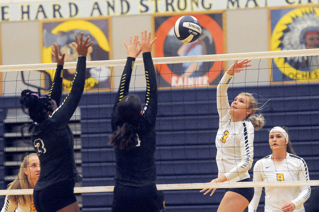 Riders’ freshman libero Lily Halberg had 32 digs, serving 13 for 13 with three aces. Middle hitter Jaida Wood had five blocks and seven kills, while middle hitter Zoe Smithson had eight blocks, five kills and served 17 for 20 with two aces. McKenzie Musalek had 21 digs and three kills.