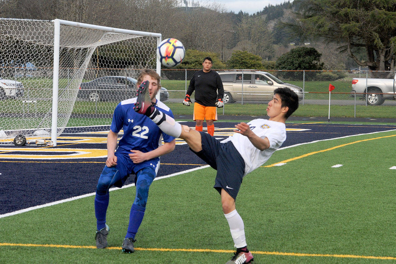 Sequim’s Liam Harris didn’t score any goals in the North Kitsap match and remains tied for first all-time with Kai Antrim for 40 career goals for the Wolves.