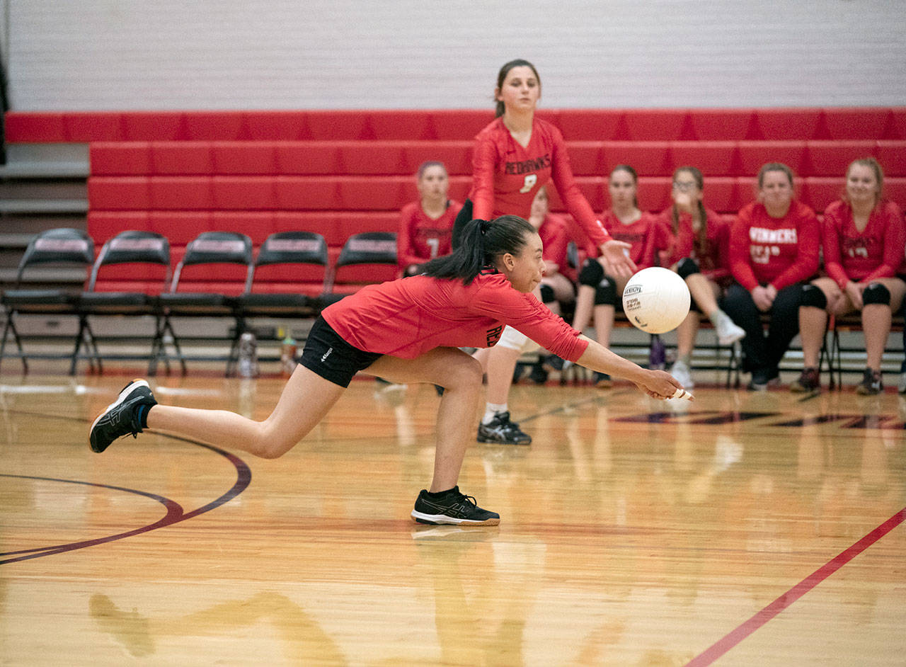 Sophmore outside hitter Kennedy Bruch contributed a huge game all over the floor with 10 kills and 28 digs, while serving 18 of 18 with four aces.