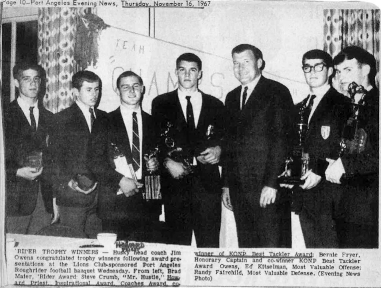 The 1967 gridiron team went 9-0 on the season and was coached by Pete Hohman, who had the highest winning percentage of Port Angeles High School football teams in history, and was inducted into the Roughrider Hall of Fame as an individual last year.