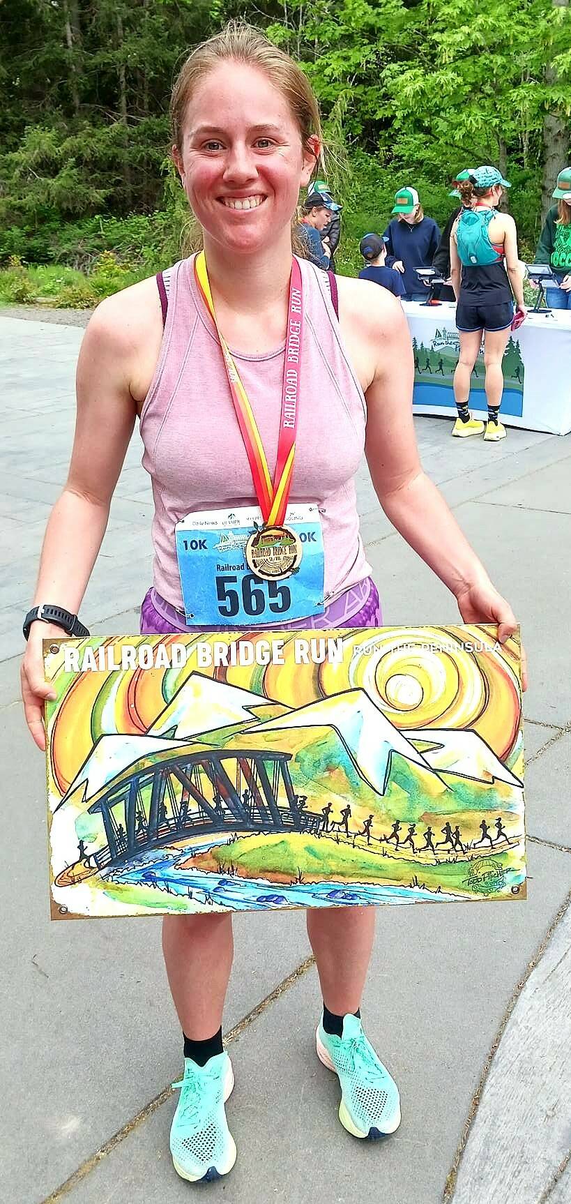 She needed to be helped off the bridge after winning the race, but a few minutes later she felt fine. She credited the training she was receiving from Club Northwest in Seattle for her win.