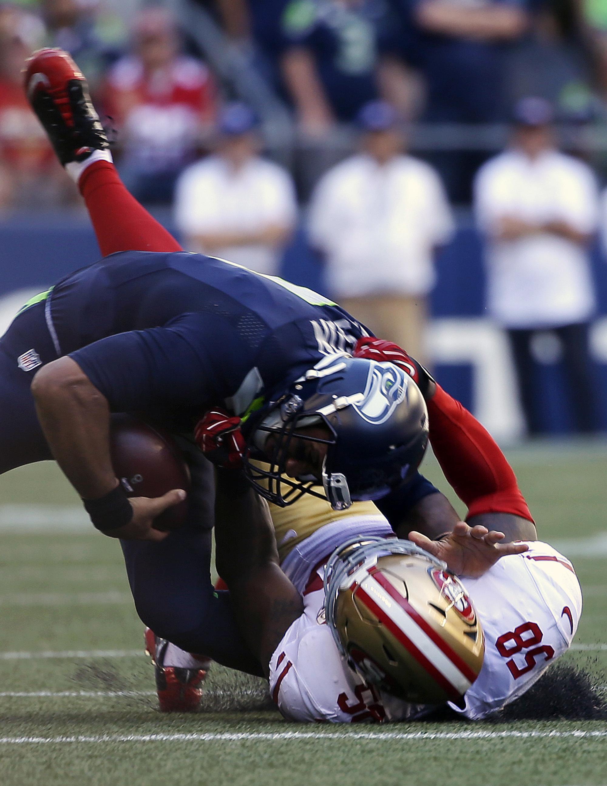 Wilson was injured with about 10 minutes to go in the third quarter getting pulled down awkwardly on a sack by San Francisco’s Eli Harold. Harold was called for a horse collar penalty, but the bigger concern was how he fell on Wilson’s left leg.