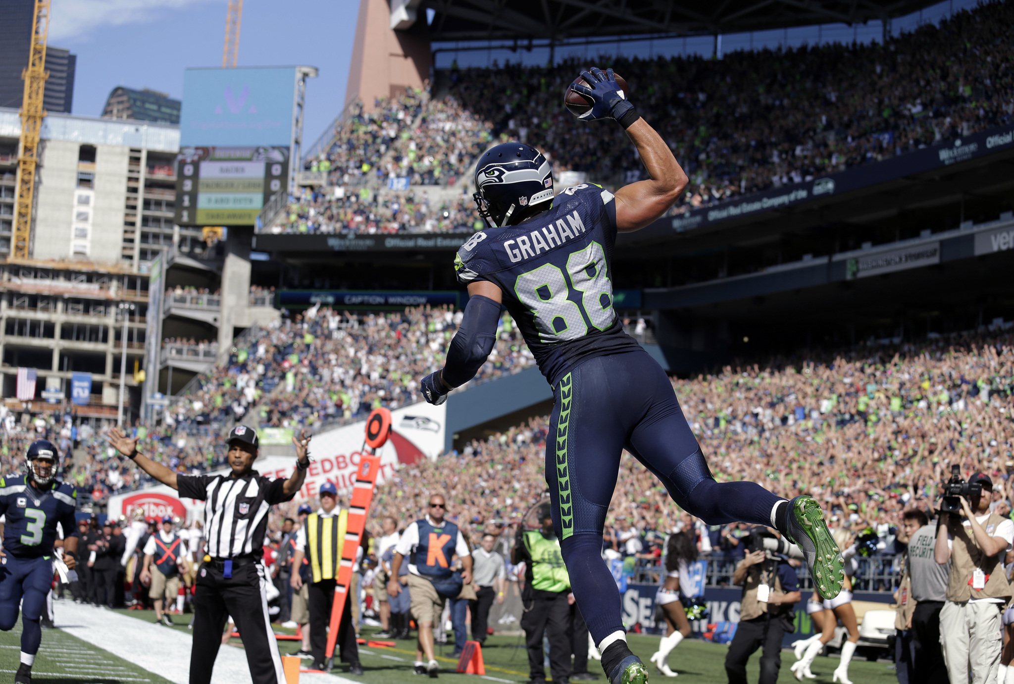 Graham seems fully back from the torn patellar tendon suffered last November. The athletic tight end had six catches for 100 yards and a touchdown in the first half on Sunday for Seattle.