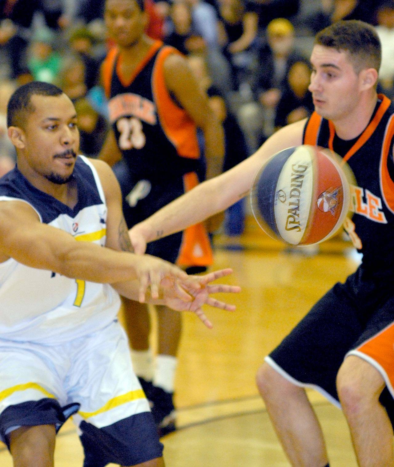 Port Angeles played strongly in the first half, defending their opponent, the Seattle Mountaineers, tightly, rebounding well despite dealing with a distinct height disadvantage, and sharing the ABA’s traditional red, white and blue basketball well in transition and in its half-court offensive sets.