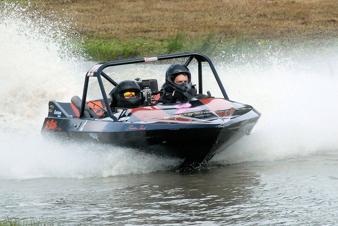 The racing team of Sharon Hauser as navigator, left, and Phil Miller as driver takes the Fat Buddy A400 class boat around the track at Extreme Sports Park in Port Angeles on Saturday. (Keith Thorpe/Peninsula Daily News)