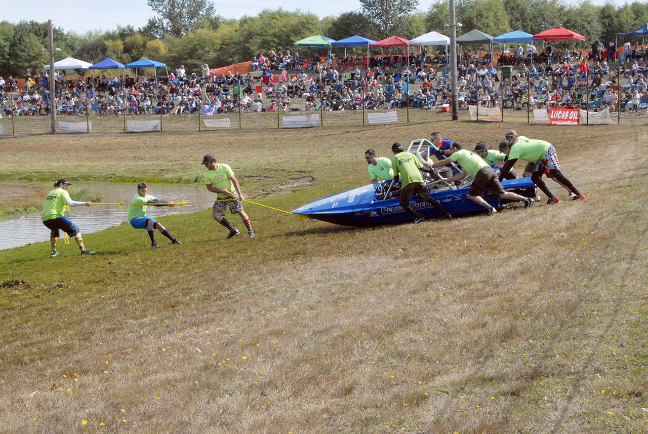 An “island hopper” safety crew pulls the Blue Bayou super modified boat driven by Clayton Hatch and navigated by Dylan Hatch back to the course after the boat leaped from the water and slid into a fence Saturday. (Keith Thorpe/Peninsula Daily News)
