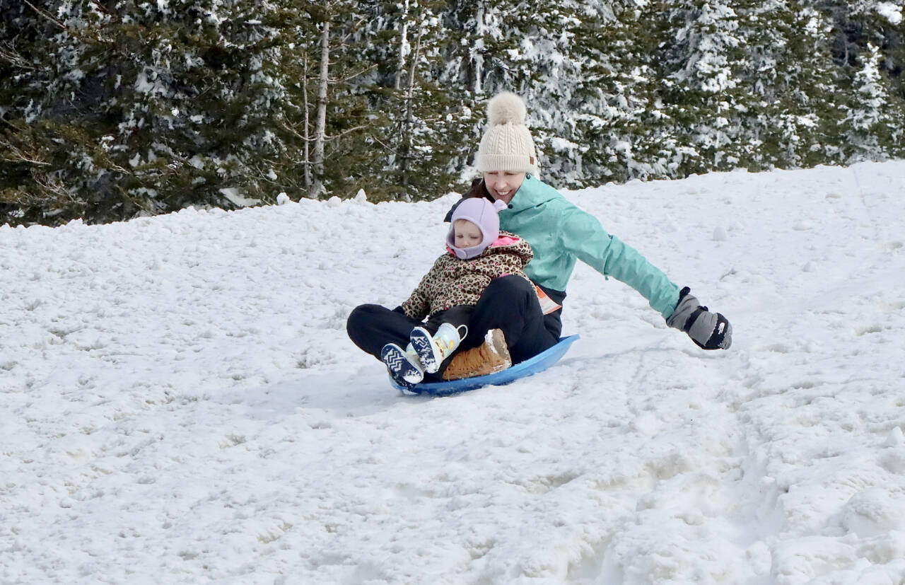 Liz Roubik and her daughter Linnea, 2, of Port Angeles, sled down the slopes at Hurricane Ridge on Sunday. It was winter sports fun for the beginning of spring break. There continues to be plenty of snow left at the ridge for sledding and snowboarding. (Dave Logan/for Peninsula Daily News)