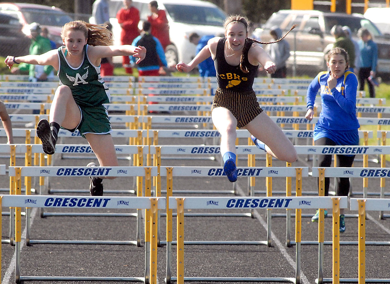 100-meter hurdles — Molly McCoy, CB, first, 19.89; Wenzl, PA, 19.95; Ruiz-Darling, PA, 23.02; Acacia Bergstrom, Crescent, second, 23.06.
