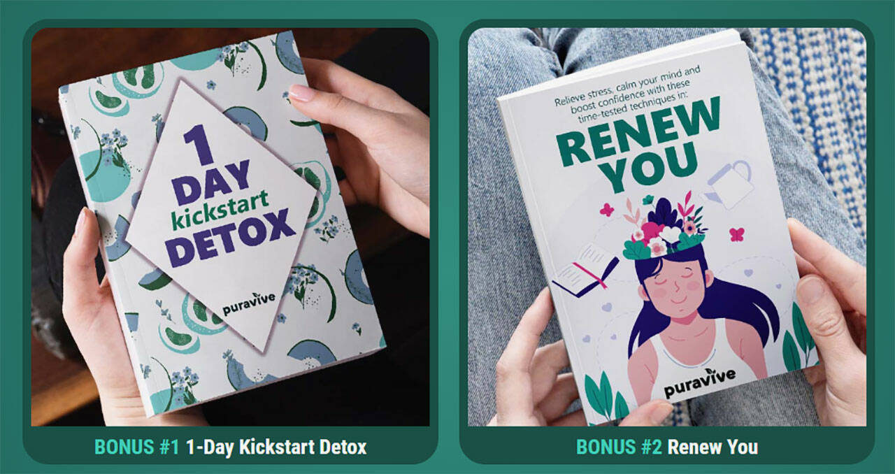 • Free Bonuses with Bulk Orders: Purchasing three or six bottles of Puravive provides additional bonuses, including a 1-Day Kickstart Detox guide and a Renew You guide, which aim to support the overall wellness journey.