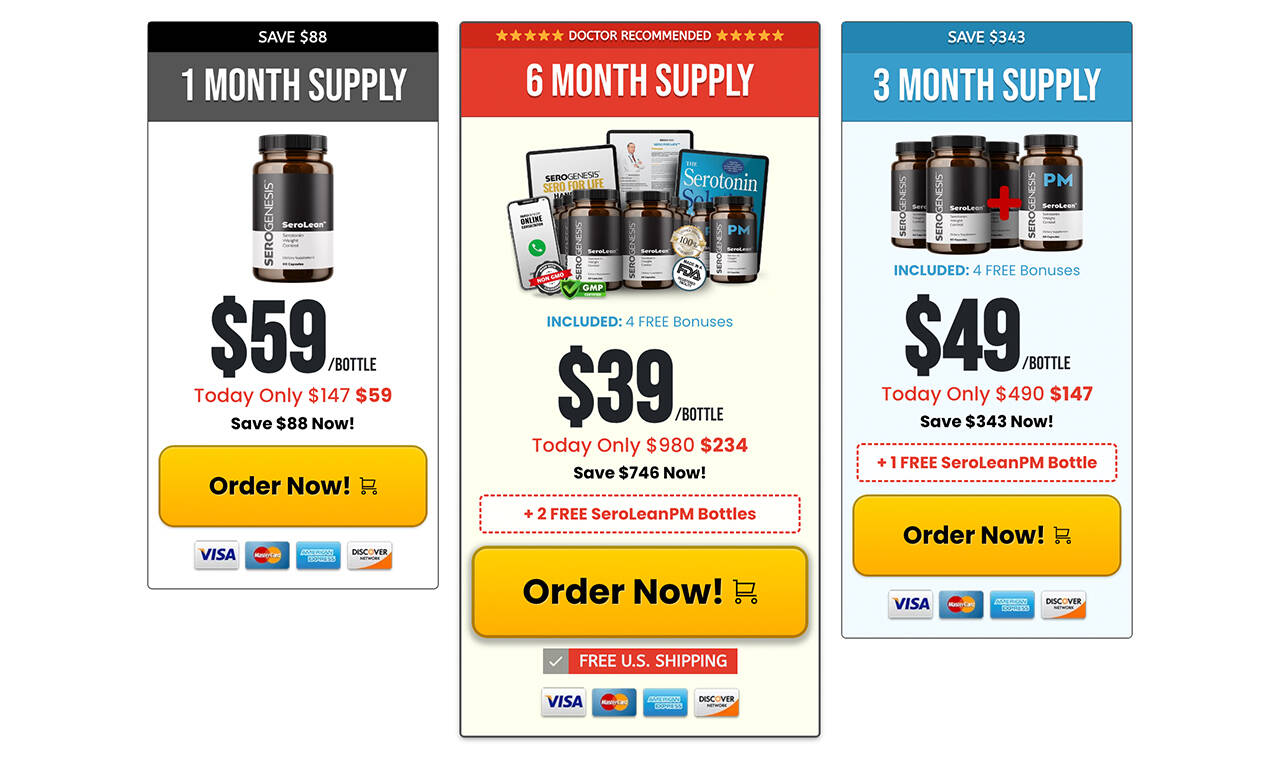 - Purchase Three Bottles of SeroLean AM and Get two complimentary bottles of SeroLean PM for $49.00 Each + Four Free Bonuses