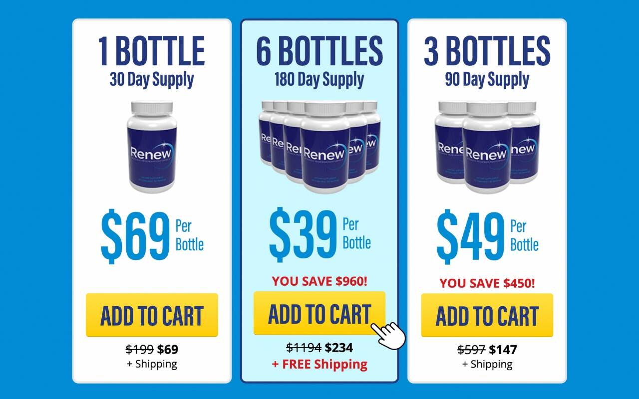 - Offering a 90-day supply of Renew, the 3-bottle package is priced at $49 per bottle.